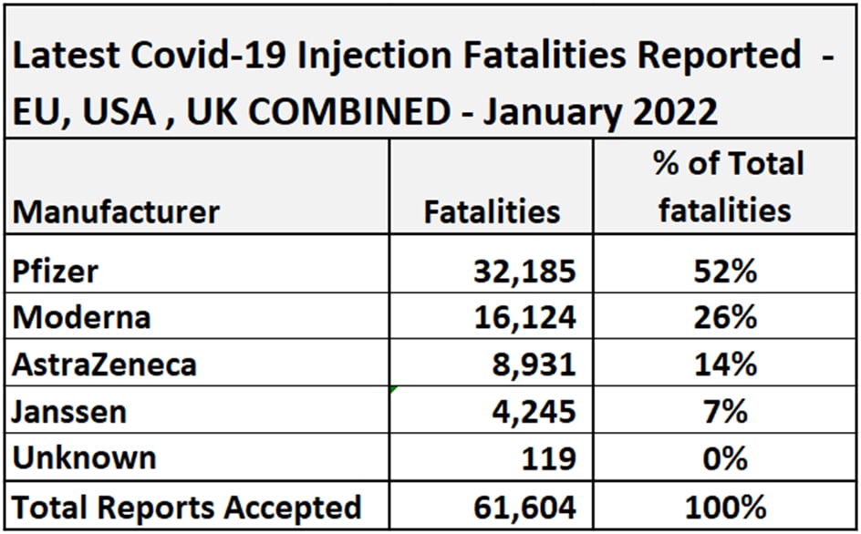 EU / USA / UK– 61,604 Covid-19 injection related deaths, plus over 9.7 million injuries now reported by over 2.8 million people –January 2022.